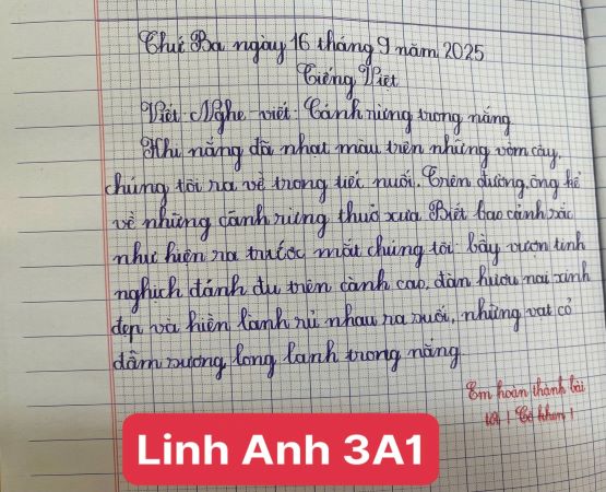 Hôm nay, trong giờ học, cô Nhật Lệ rất vui khi được ngắm nhìn những bài làm Toán và Viết của các con. Có nhiều bạn đã trình bày bài Toán thật ngay ngắn, rõ ràng, từng con số thẳng hàng, sạch sẽ và chính xác. Những bài Viết của các con cũng thật đẹp, chữ viết đều nét, rõ ràng, không có lỗi sai, thể hiện sự cẩn thận và chăm chỉ. Nhìn những trang vở sạch sẽ, gọn gàng, cô thấy được sự cố gắng và tinh thần học tập nghiêm túc của các con. Những bài làm ấy xứng đáng được tuyên dương và khen ngợi. Cô tin rằng, với sự kiên trì, các con sẽ tiếp tục giữ vở sạch, chữ đẹp và đạt nhiều thành tích tốt hơn nữa trong học tập.