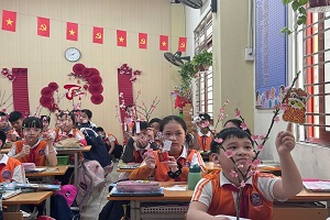 Hoạt động không chỉ rèn luyện sự tỉ mỉ, khéo léo mà còn giáo dục ý thức tiết kiệm, bảo vệ môi trường thông qua việc tái chế cành đào cũ. Những thông điệp được viết tỉ mỉ bằng Tiếng Anh của các em chính là điều khiến cành đào đặc biệt này trở nên ý nghĩa và giá trị hơn bao giờ hết. Từ những vật liệu giản dị, các em đã tạo nên những cành đào rực rỡ, gửi gắm yêu thương và hy vọng cho một mùa xuân mới tràn đầy niềm vui. Tiết học Tiếng Anh đầu tiên trong ngày đầu năm mới đầy ắp tiếng cười với những lời chúc hân hoan, đáng yêu của cả cô và trò. Thông qua hoạt động thú vị này, các em có thêm nhiều cơ hội để thể hiện năng khiếu cũng như giao lưu phát triển nhiều hơn về Tiếng Anh.
